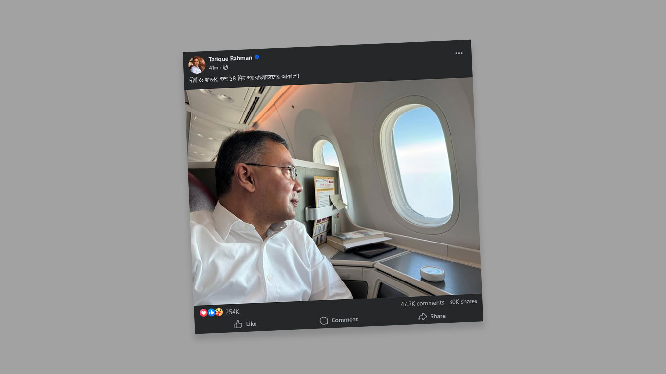 নিজের ভেরিফায়েড এক ফেসবুক পোস্টে তারেক রহমান লিখেছেন, ‘‘দীর্ঘ ৬ হাজার ৩১৪ দিন পর বাংলাদেশের আকাশে।’’ সকাল ৯টা ৩৪ মিনিটে দেওয়া ওই পোস্টে তিনি একটি ছবিও সংযুক্ত করেছেন।