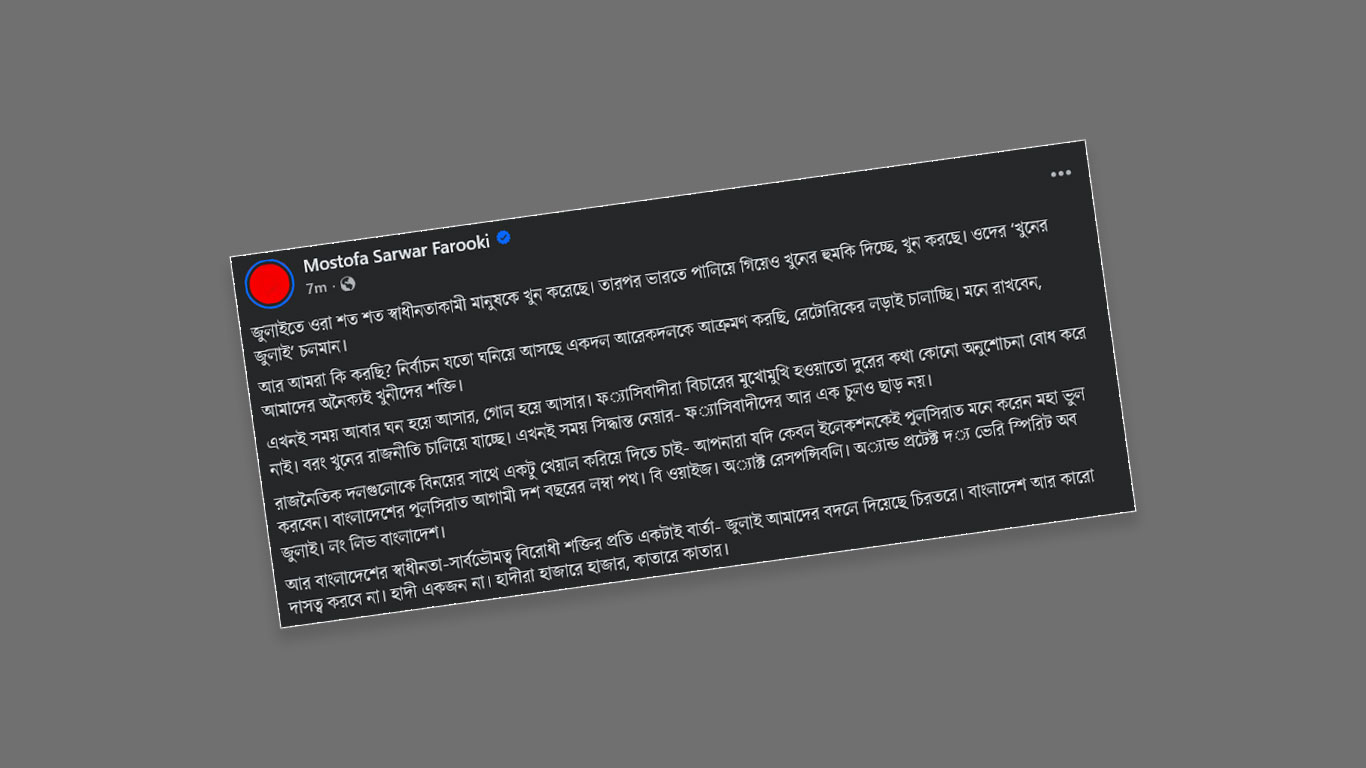 ফ্যাসিবাদীদের আর কোনো ছাড় দেওয়া হবে না উল্লেখ করে পোস্টে ফারুকী লিখেছেন, ‘‘ফ্যাসিবাদীরা বিচারের মুখোমুখি হওয়াতো দূরের কথা কোনো অনুশোচনা বোধ করে নাই। বরং খুনের রাজনীতি চালিয়ে যাচ্ছে। এখনই সময় সিদ্ধান্ত নেওয়ার- ফ্যাসিবাদীদের আর এক চুলও ছাড় নয়।’’