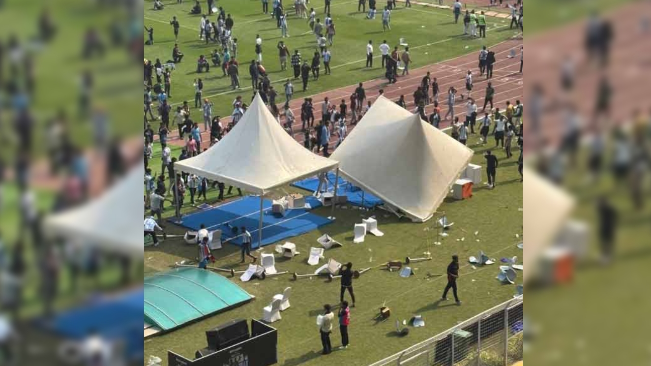 আর্জেন্টিনার তারকা মাঠ থেকে বেরিয়ে যেতেই পরিস্থিতি উত্তপ্ত হয়ে ওঠে। বেশি দামে টিকিট কিনে মাঠে এসেও মেসিকে দেখতে না পাওয়ায় ফুটবলপ্রেমীরা ক্ষুব্ধ হয়ে ওঠেন। শুরু হয় গ্যালারিতে লাগানো হোর্ডিং ভাঙচুর। পরে গ্যালারির চেয়ার ভেঙে মাঠে ছুড়তে শুরু করেন ক্ষুব্ধ ফুটবলপ্রেমীরা।