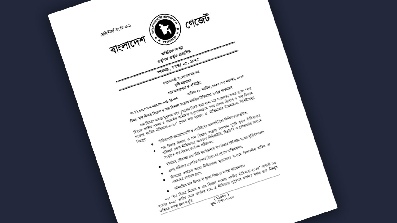 গত ১৩ নভেম্বর সার ডিলার নিয়োগ ও সার বিতরণ-সংক্রান্ত সমন্বিত নীতিমালা-২০২৫ জারি করে প্রজ্ঞাপন দেয় সরকার। ২০০৯ সালের নীতিমালা বাতিল করে এটি জারি কর হয়।